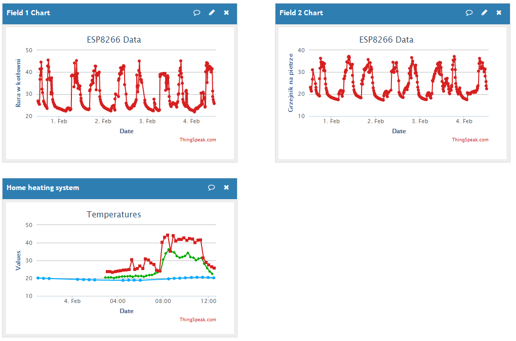 Code is also pretty straight forward: connect to WiFi, read temerature from DS18B20, sent temperature to ThingSpeak, go to sleep for 15 minutes, reboot and start again.