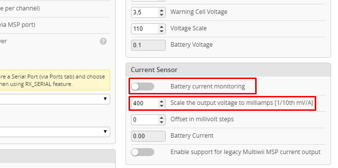 Once APM Power Module is connected to flight controller, we have to enable and configure it. Use Configurator software and enable it.