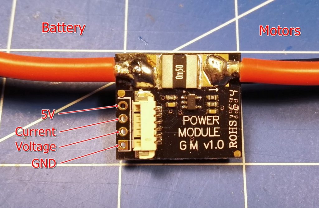 - Current - voltage on this pin depends on current flow. It is 0V when 0A goes through the module, and 5V when 90A goes through it. This is a pin we have to connect to flight controller