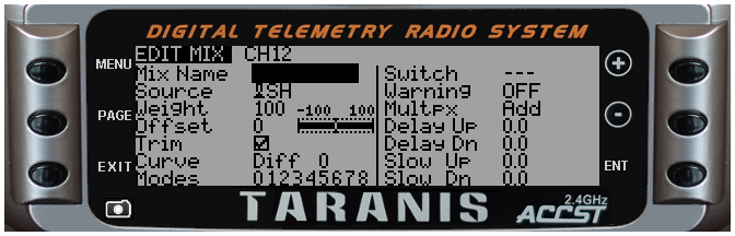 Also, since binding is required every time power is cycled, it is a good idea to mix switch SH to channel 12. CH12 is a bind channel: E010 quadcopter will bind to Taranis every time CH12 will be switched HIGH. So, after you switch battery, just flip switch SH and done: ready to fly.