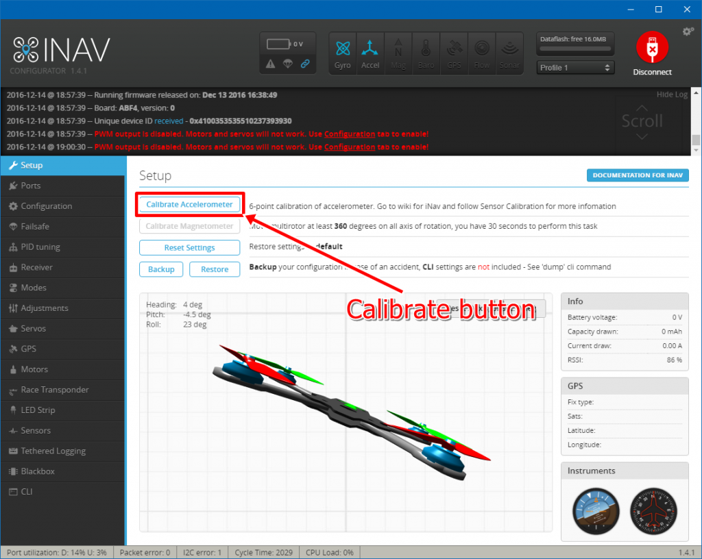 - Rotate FC so its front edge is facing down and hit "Calibrate acccelerometer" button. Wait for success message