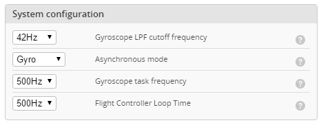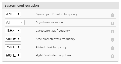 Frequencies available in "Gyroscope task frequency" and "Flight Controller Loop Time" depends on chosen "Gyroscope LPF cutoff frequency". Gyro task frequency should be kept above Control Loop Frequency.