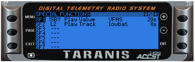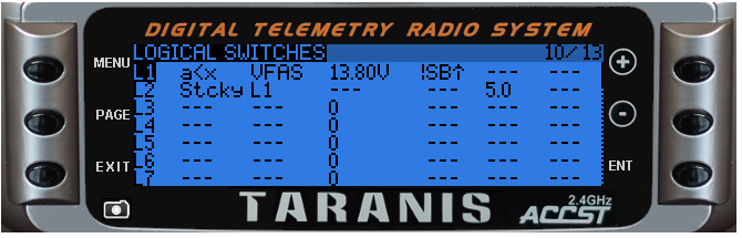 - L1 that activates when battery voltage is below threshold. I'm using 4S and decied to use 13.8V as my threshold value. In my case, I'm using Switch B for arming, so I also included it in this condition. I want Taranis to send me warnings and report voltage only when I'm armed.
